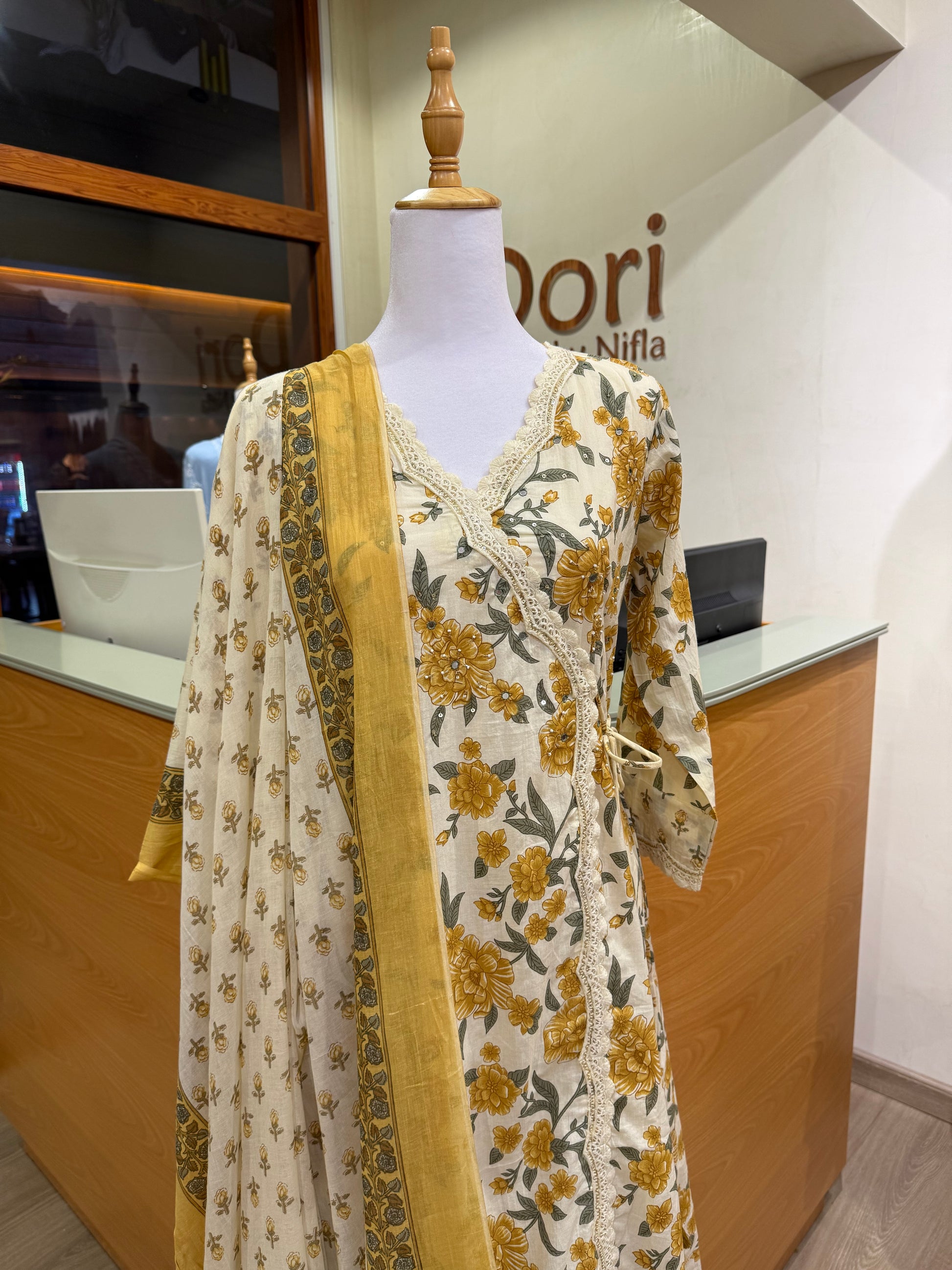Pure cotton suit set features an elegant Angrakha style A-line kurta adorned with beautiful floral details and delicate lace on the sleeves and hemline. Perfect for daily wear or a minimal festive look, this versatile set comes in a stunning beige and floral combo. Elevate your wardrobe with this timeless and sophisticated piece.