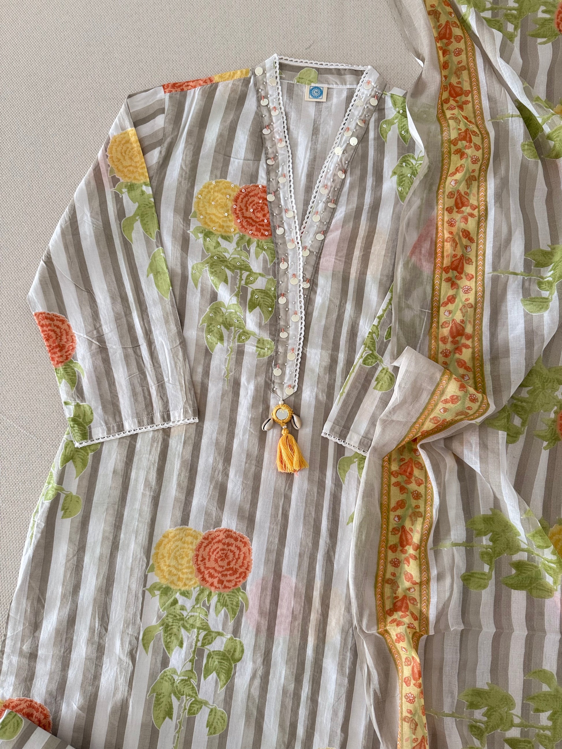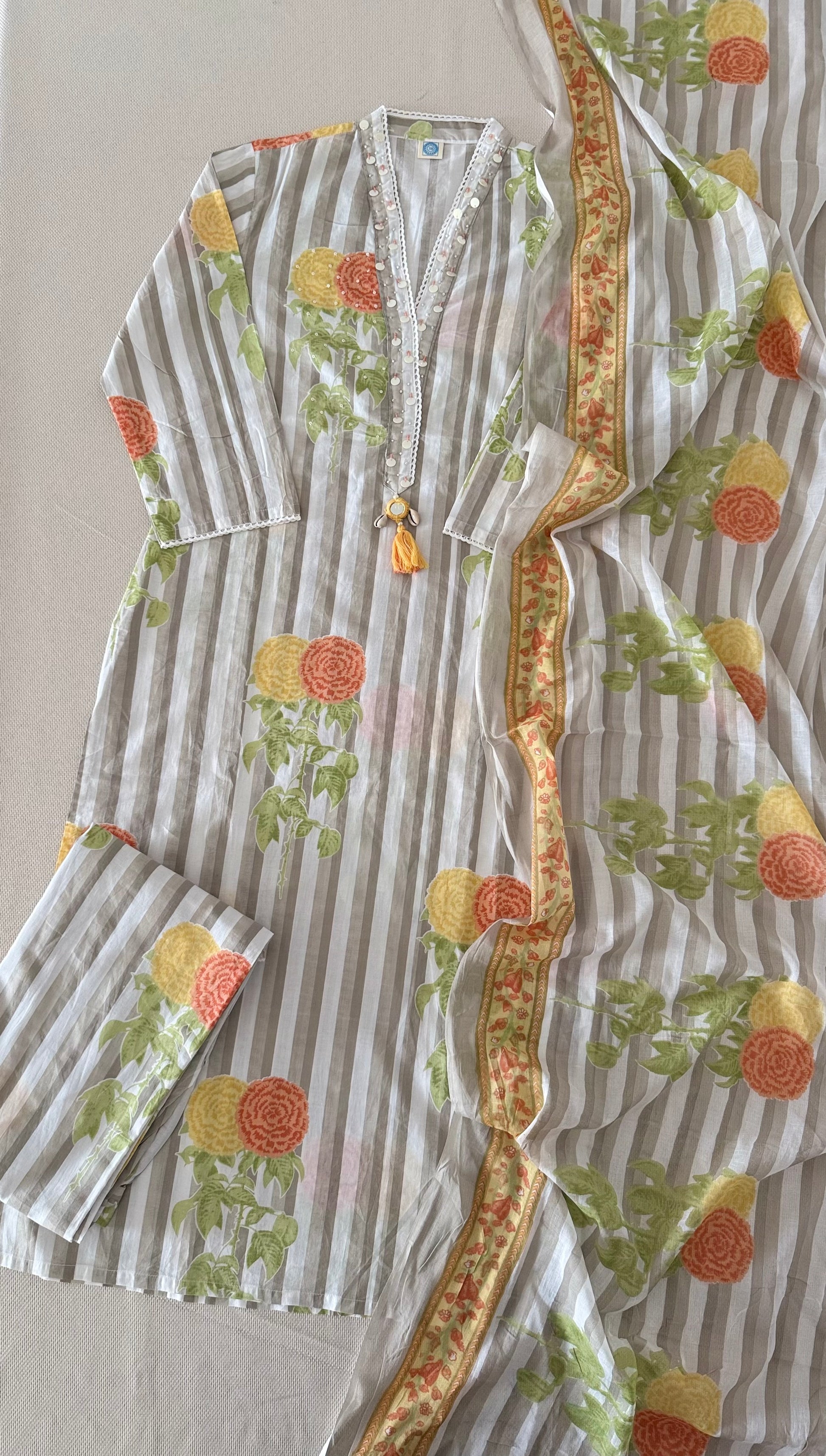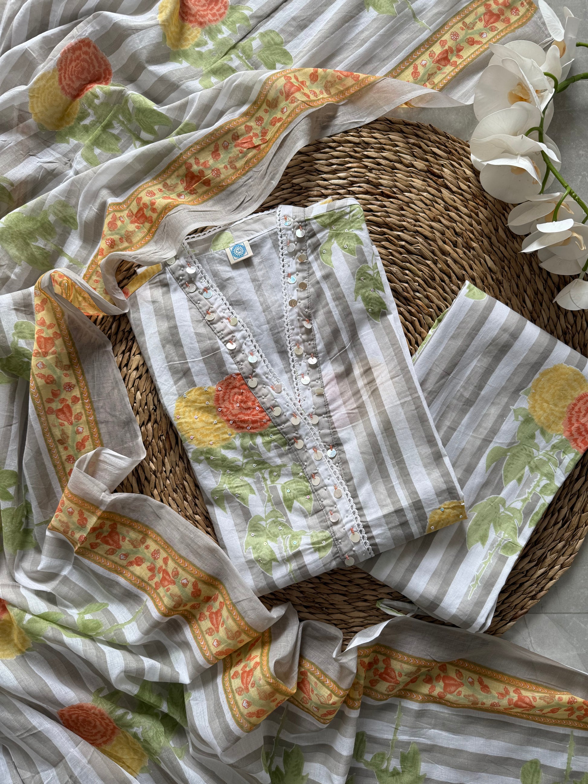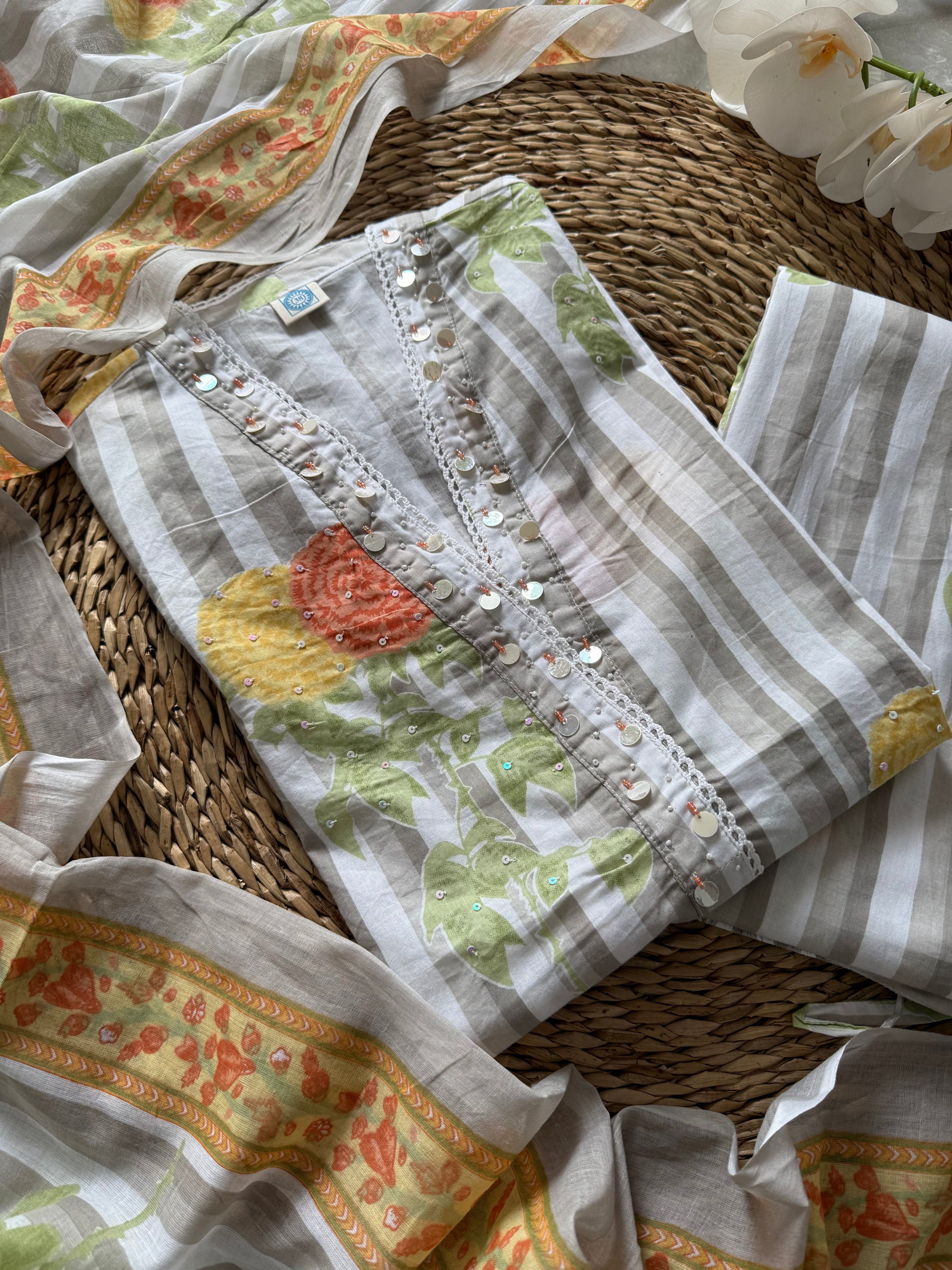 🌸This Hemanika suit set is perfect for daily wear with its elegant v-neck pattern and beautiful floral details. The straight kurti, palazzo pant, and full size cotton dupatta add both style and comfort to your outfit. Experience the perfect blend of fashion and functionality with this stunning suit set.
