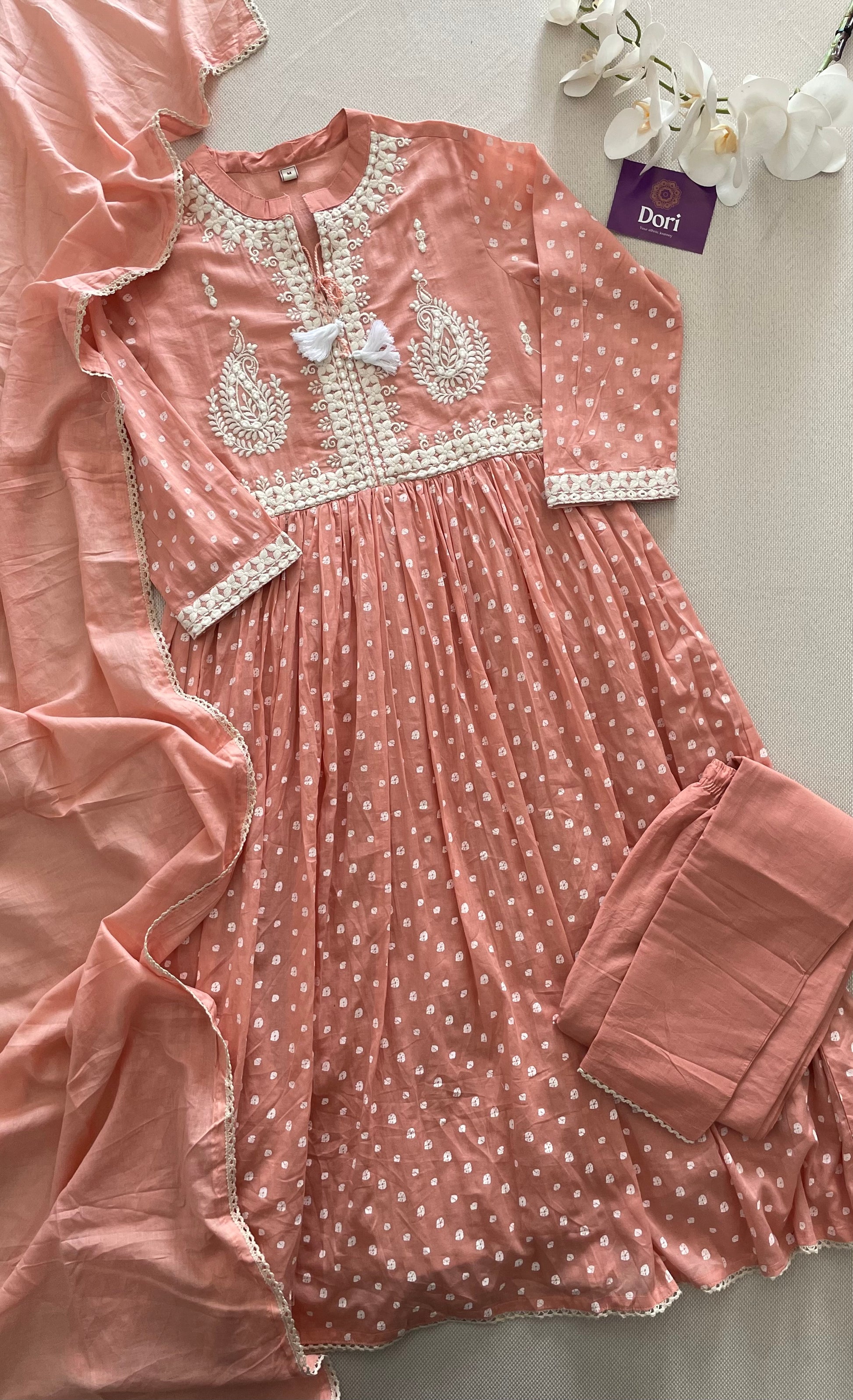 🌸This Peach Bandhej Anarkali is a must-have for any festive occasion. The beautiful thread embroidery on the yoke adds a touch of elegance to the cotton fabric. The bandhej print all over the kurti, paired with a straight pant and cotton dupatta, makes it a perfect traditional outfit. Comes with a soft mul lining for added comfort.