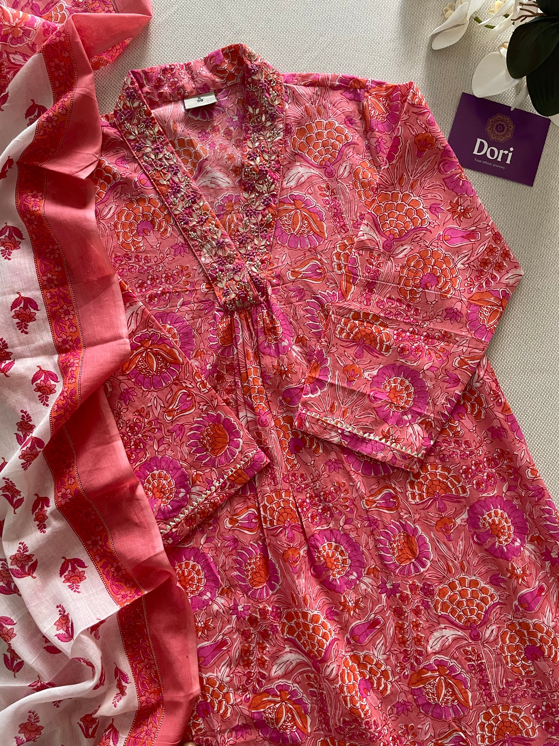 š·This Cotton Suit Set is crafted from pure cotton and features a stunning floral print. The V-neck design is enhanced with delicate thread embroidery, adding a touch of elegance to this set. Complete with a straight pant and full size mul dupatta, it offers both style and comfort.